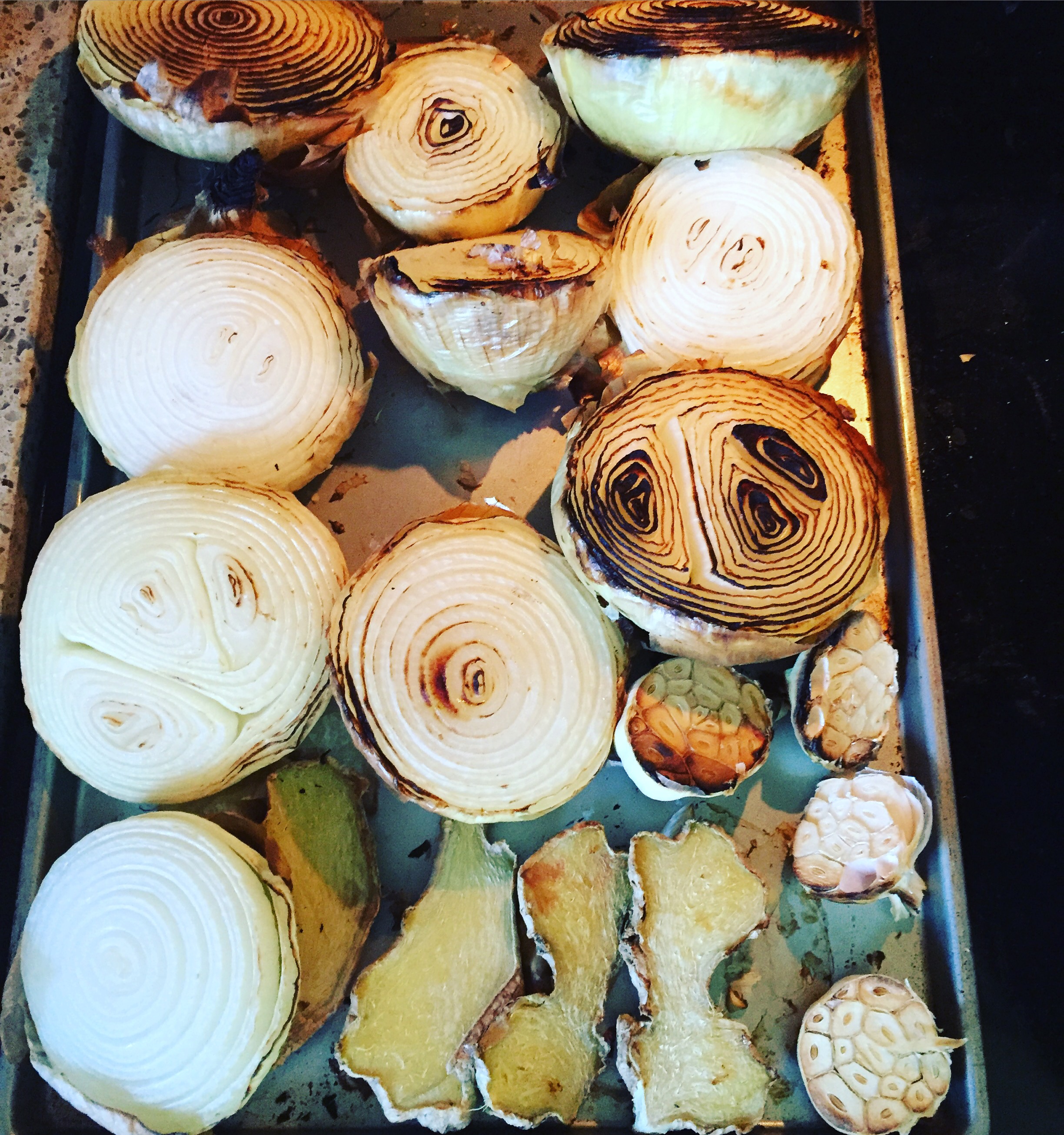 - Charbroil the Aromatics: Add onions, garlic and ginger to a cookie sheet or oven proof pan and broil until well charred. Cooking times will vary so keep a close eye on it. Took approx 10 minutes for us.