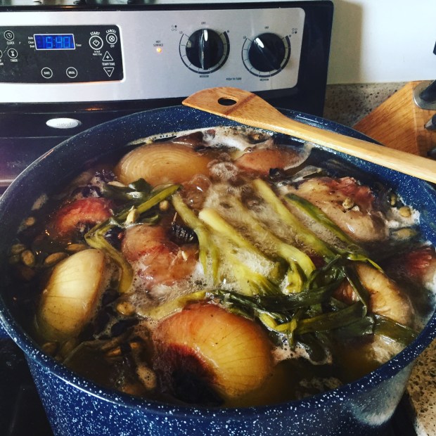 You start by par boiling the bones to get rid of the “muck”. This is the Beef Bones and the Cow’s Feet. To par boil, you just throw them in a pot, cover with water and bring to a vigorous boil for 5 minutes. You won’t believe the amount of muck. After the 5 minutes, pour through a colander and rinse with cold water and make sure the bones are clean. You may need to actually use your hands to scrub any stubborn muck off. Make sure to keep an eye out for any marrow or meat that might have some from the bones and add those back to the pot as well.