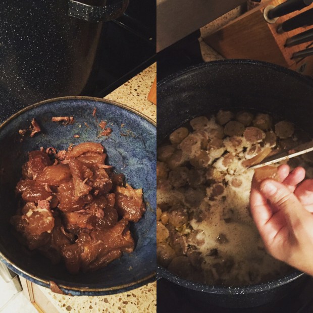 Now, throw everything and one bunch of Scallions and 2 ounces of Rock Sugar (yellow lump rock candy) into your pot and cover with water. Bring to almost a boil and then reduce heat to the lowest setting. You don’t want to actually boil it and it should simmer very slowly for 6-8 hours. The original recipe goes on to talk about how restaurants will actually keep a pot on the stove non stop and just keep adding to it. They even recommend if not already on the smallest burner, to then move to the smallest burner on the lowest heat to further cool the process.