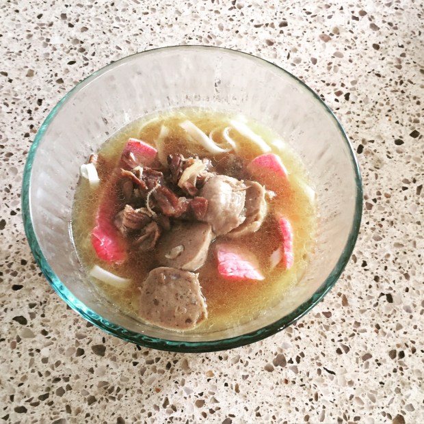 Then, top with that yummy broth. Be sure to get plenty of meat bits, tendon and meatballs!
