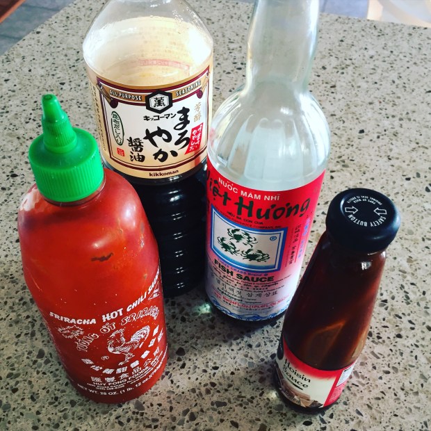 Some of my recommended condiments are Sriracha chili sauce, Soy Sauce, Fish Sauce and Hoisin Sauce.