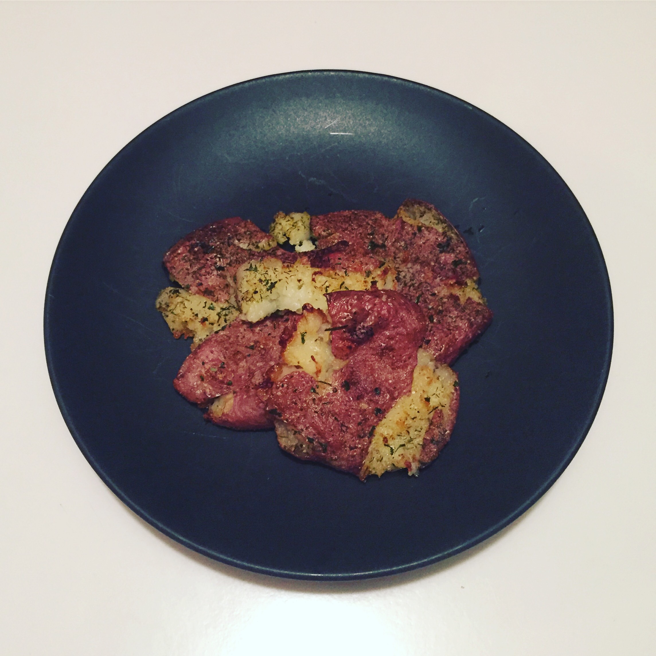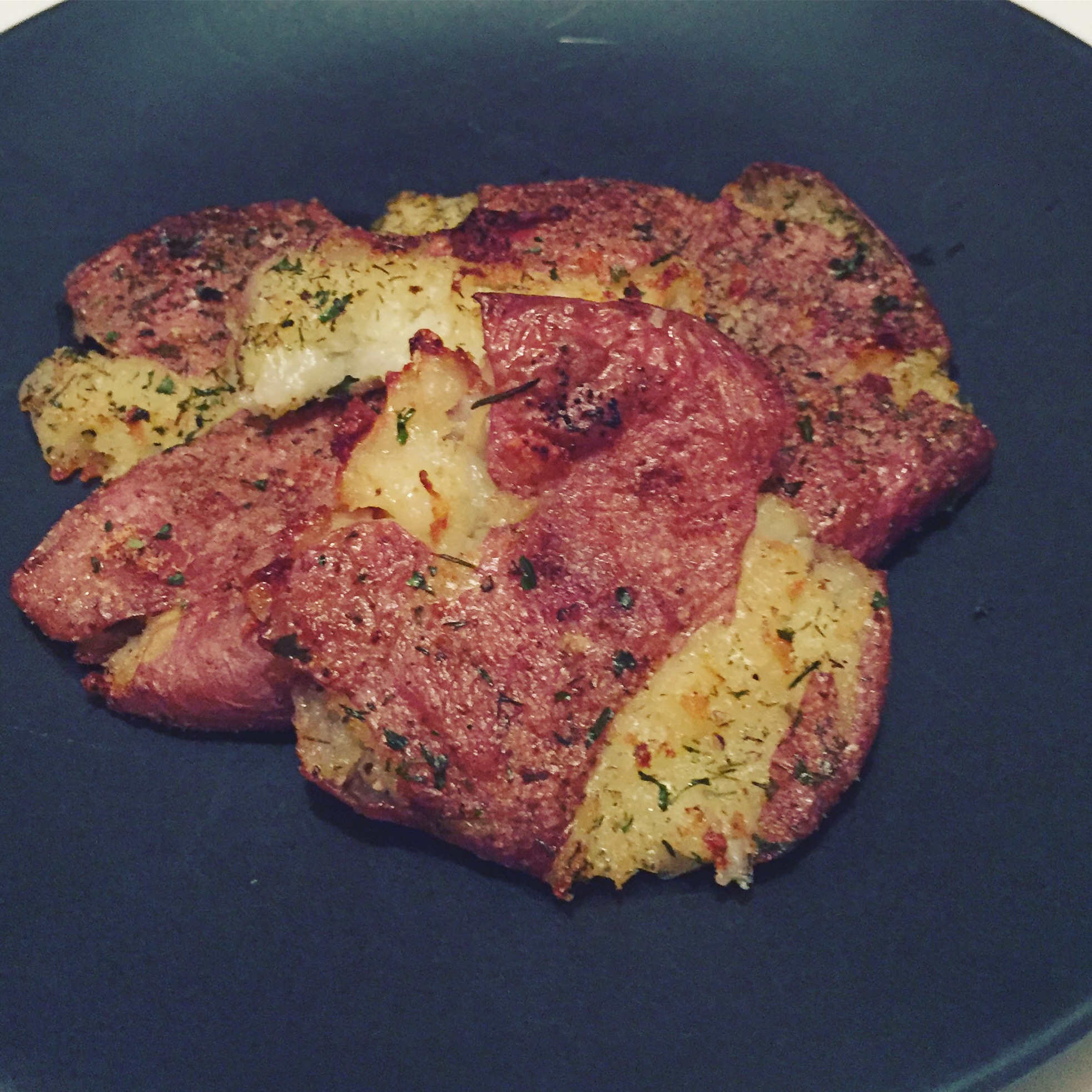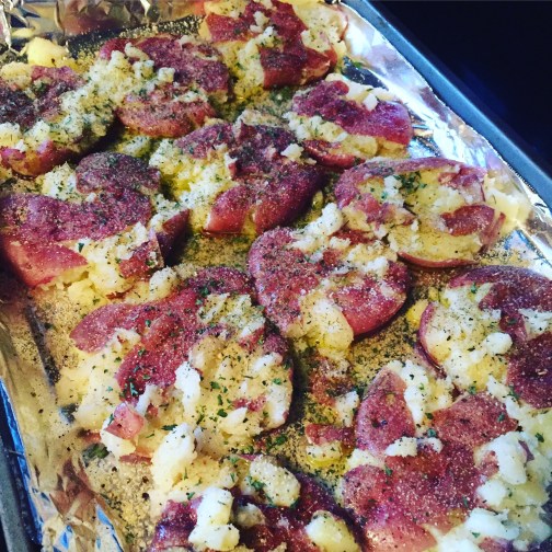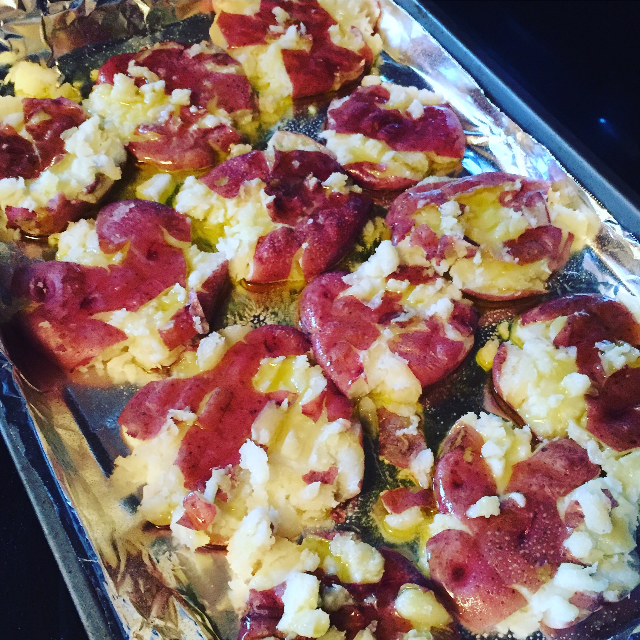 - Once smashed, coat generously with Olive Oil and dust with seasonings to taste.