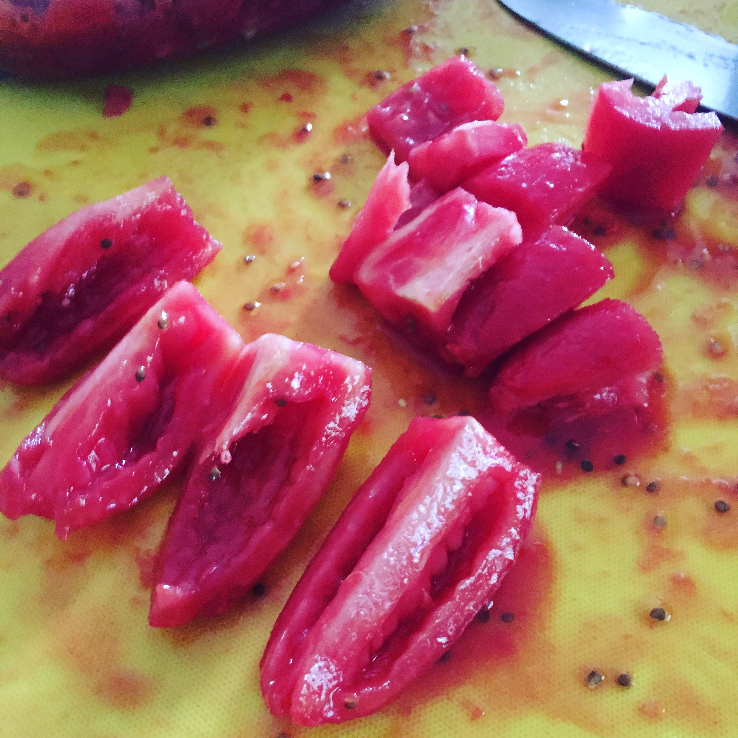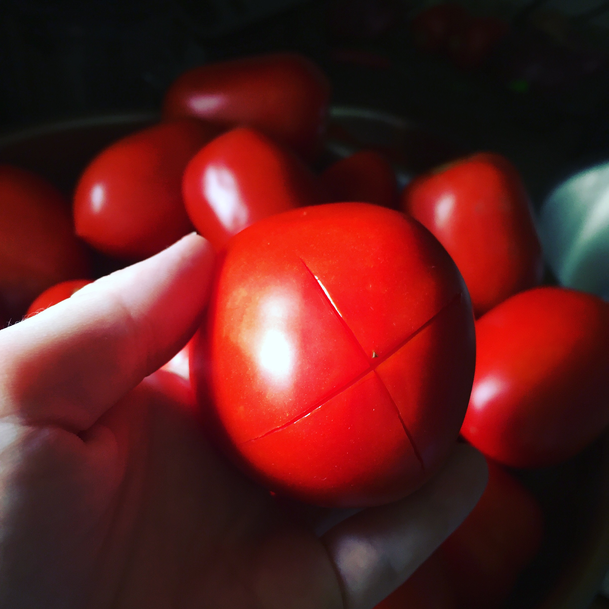 Once the tomatoes are peeled, I recommend that you seed them as well. Be patient, this is a process but I feel it really helps in the log run. To see them, I cut them into quarters and scraped out the seed with my fingers. Once deseeded, cut into desired size (I cut my Roma tomatoes in half, so about 1 inch chunks).