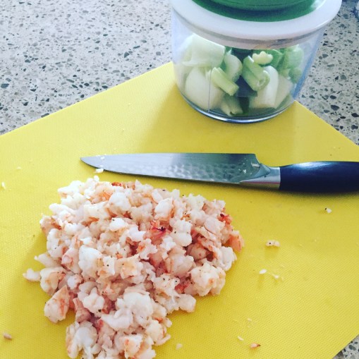 I’ve found that I much prefer my Shrimp and Chicken Salads more finely chopped so it’s easier to pile onto crackers, sandwiches, etc. It’s easier for the kids to eat too. So, my recipe will show things pretty finely chopped but obviously you can do this to your preference. I always bust out my handy dandy hand chopper!